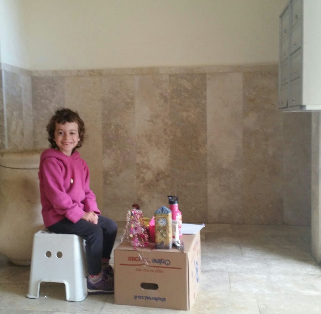 תוך כמה דקות העבירה את החנות ללובי של הבניין, בעזרת שני הורים סבלים. עם שרפרף במקום כיסא וארגז של שופרסל בתור דוכן, היא התיישבה ללכוד שכנים שיקנו את מרכולתה.